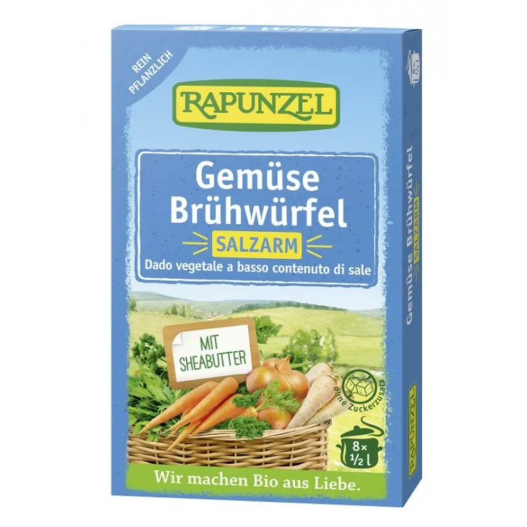 Συστατικά: Άμυλο καλαμποκιού*, βούτυρο καριτέ* (20%), λαχανικά (17%) (καρότο*, κρεμμύδι*, σέλινο*, παστινάκι*, πράσο*), θαλασσινό αλάτι, εκχύλισμα μαγιάς*, ηλιέλαιο*, κουρκουμάς*, περίβλημα μοσχοκάρυδου*, φύλλα λεβιστικού*, φύλλα σέλινου*, μαϊντανός*, σκόρδο*, θυμάρι* δάφνη*. (*= Προϊόν βιολογικής γεωργίας).