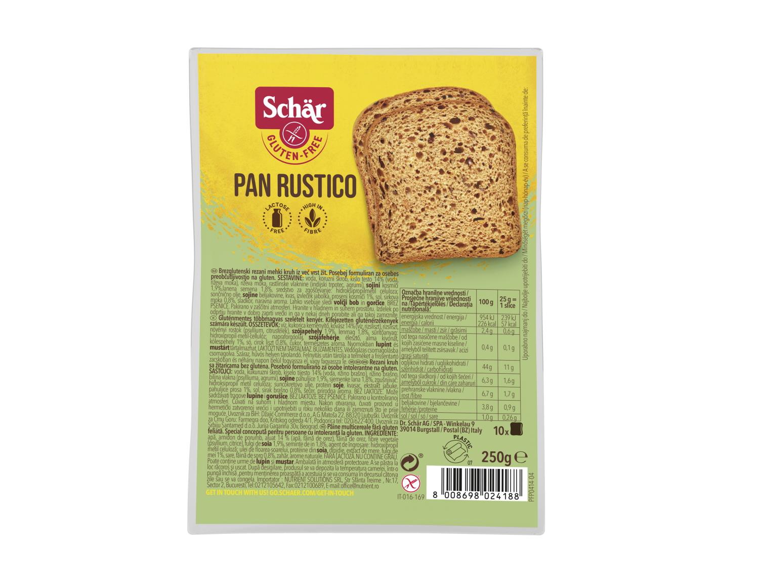 Συστατικά: νερό, άμυλο αραβοσίτου, προζύμι ρυζιού 16% (νερό, ρυζάλευρο), ρυζάλευρο, φυτικές ίνες (ψύλλιο), λιναρόσπορος (2%), νιφάδες σόγιας (2%), πυκνωτικό μέσο: υδροξυπροπυλομεθυλοκυτταρίνη; ηλιέλαιο, πρωτεΐνη σόγιας, μαγιά, εκχύλισμα μήλου, νιφάδες κεχριού (1%), αλάτι, αλεύρι σόργου (1%), ζάχαρη, ίνες εσπεριδοειδών, καραμελωμένη ζάχαρη. Μπορεί να περιέχει ίχνη από λούπινο.